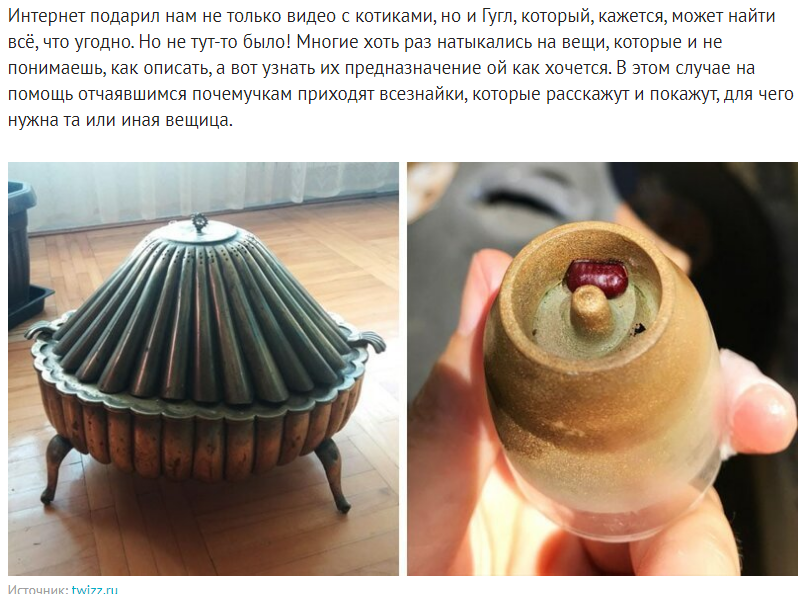 1. «Внутри белая пудра, крышку можно снять. Пробка для того, чтобы можно было понять размер» 2. «Странная машина. Фары завёрнуты в ткань. Номера по всей машине» Так обычно скрывают машины на тест-драйве, чтобы модели которые скоро выпустят, не могли сфотографировать. Узор изменяет контуры машины и мешает понять, какой она формы. 5. «Что это за маленькая коричневая штука на дне стакана?» Это тараканье яйцо. 6. «Иголки острые, но не настолько, чтобы проколоть кожу. Что это?» Устройство для разметки ткани при шитье. Используется для создания ровных стежков — иголка вставляется в оставшиеся после него точки. 7. «Нашёл это у отца в комнате. Надеюсь, что это не что-то компрометирующее» Эта штука надевается на ботинки, чтобы не скользить на льду. 8. «Нашёл в коллекции «сокровищ» моей тёти. Кажется, внутри что-то металлическое и тяжёлое» Эта штука не опасна. Это специальный камень, который используется, чтобы отследить движение прибрежного течения.