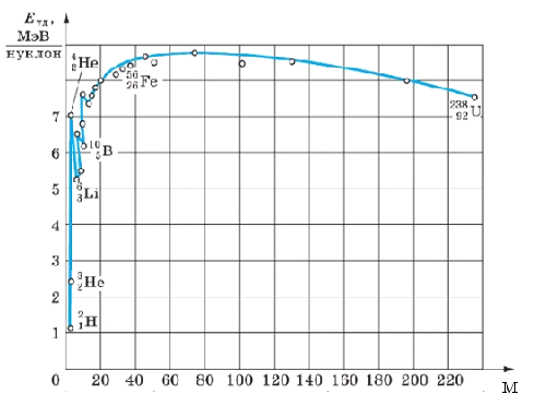 Для упрощения расчётов в современной физике введено понятие удельной энергии связи, т.е. энергии связи одного нуклона. График, показывающий зависимость удельной энергии связи для нуклонов всех элементов таблицы Менделеева представлен ниже.