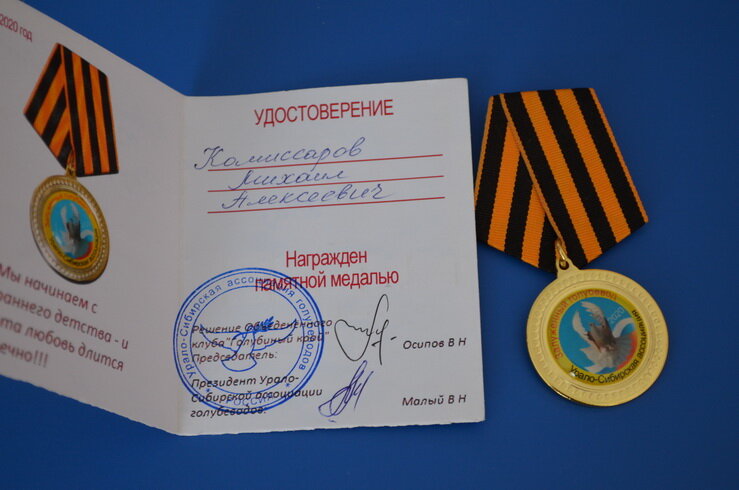 Михаил Комиссаров посетил третью международную выставку голубей в Красногорске, где ему вручили медаль «Заслуженный голубевод Урало-Сибирской ассоциации голубеводов» Вместе с Михаилом Алексеевичем на выставке присутствовали Ксения Калинина, Александр Худяков, Павел Аганин, Николай Выдрин из Уйского, Владимир Первухин из Брюхово, Михаил Бочков из Маслово. По словам Михаила Комиссарова, организаторы посвятили фестиваль 75-летию Победы в Великой Отечественной войне. На выставке в Красногорске десяти голубеводам Урало-Сибирской ассоциации из разных городов, в том числе Михаилу Алексеевичу, присвоили звание и вручили медаль «Заслуженный голубевод Урало-Сибирской ассоциации голубеводов». - Это звание в России официально ввели только в этом году и на прошлой неделе были вручены самые первые награды. Медали присваивают голубеводам, которые занимаются разведением голубей, в том числе чистопородных птиц, на протяжении многих лет; проводят выставки, - говорит Михаил Комиссаров. Отметим, что