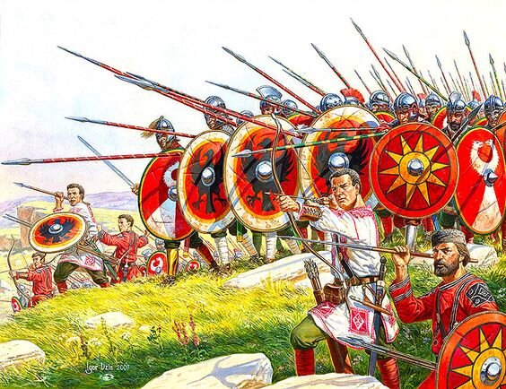 Ещё раз о пехоте Итак в галльской армии времен Юлиана, согласно Аммиану, мы имеем 10 подразделений пехоты. 7 отрядов auxulia и 3 легиона. Сведения, которые мы можем почерпнуть из текста Аммиана Марцеллина, говорят за то, что подразделения auxilia или, по крайней мере, некоторые из них считались легковооруженными. Вегеций, хотя и не называет подразделения auxilia легкой пехотой, говорит, тем не менее, что вооружение легионеров было более тяжелым (graviora arma — II. 3). С другой стороны, мы видим, что в сражении ауксилиарии действовали как обычная линейная пехота, а тактические приемы, которые они использовали, не отличались от обычных римских. Так, например, корнуты и бракхиаты в битве при Аргенторате выстраиваются черепахой (in modum testudinis — Amm. XVI. 12. 44; ср.: XXIX. 5. 48; XXXI. 7. 12). Кроме того, в резерве, где обычно оставляли отборный отряд (subsidialis robu