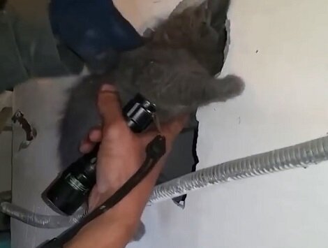 В течении недели сотрудники одного предприятия иногда слышали еле различимое мяуканье из-за стены. В итоге осмотрели подвал за стеной, но никого не нашли. Стало понятно - котёнок в стене и кроме нас никто его не спасёт. За этой стеной проходила вентиляционная шахта. С каждым днём мяуканье было всё слабее и его уже еле различали. Времени на обдумывания уже не было, надо было действовать. Скорей всего котёнок упал в шахту с чердака здания или может где лаз нашёл. Ребята монтёры принесли необходимые инструменты. Решили сверлить стену, чуть выше раздававшегося мяуканья. Просверлили достаточно широкое отверстие в стене. Котёнок поняв, что спасение близко начал очень громко кричать. То ли от радости , то ли от страха от работающего перфоратора. Наконец ребята увидели страдальца, но он был глубоко в шахте, рукой до него было не дотянуться. Пришлось скрутить большое полотенце и опустить его в шахту. Очень надеялись, что котёнок поймет, как нужно действовать дальше. И он догадался, крепко вц
