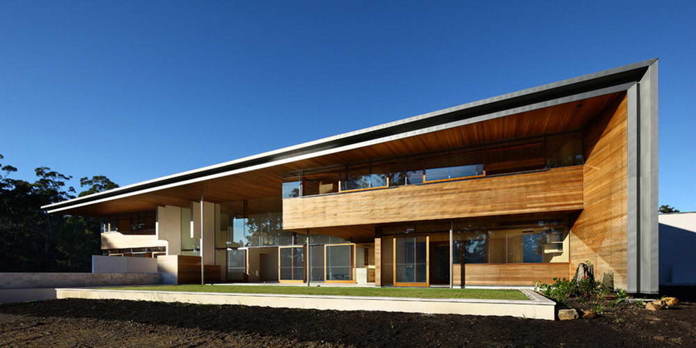 Этот светлый дом построен на просторном зелёном участке в окружении рослых деревьев. В этом проекте простота формы и планировки сочетаются с большим акцентом на материальные качества, определяемые внешней и внутренней оболочкой из высококачественной древесины (красный канадский кедр). У дома полностью односторонняя ориентация — он открыт стеклянными витражами, защищёнными эффектным козырьком, в сторону двора и бассейна. Название: Резиденция Тинбирва (Tinbeerwah Residence)