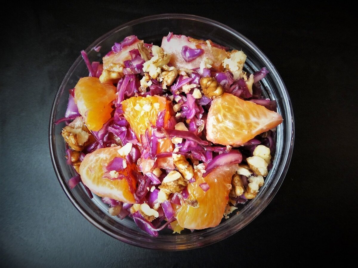 с апельсинами и орехами. Такой же салат Вы можете приготовить из белокочанной капусты, но вкус будет, конечно, другой, но вариант такой может быть. Вы непременно полюбите этот салат за простоту приготовления, необычный вкус, яркость и супер-полезность.