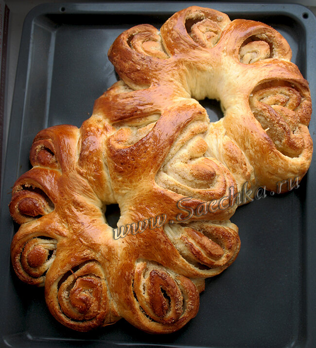 - Свернуть тесто в рулет и сделать из него кольцо или придать любую другую форму (форму пирога изменила на восьмёрку в честь праздника 8 марта). Переложить тесто на застеленный пергаментной бумагой противень.