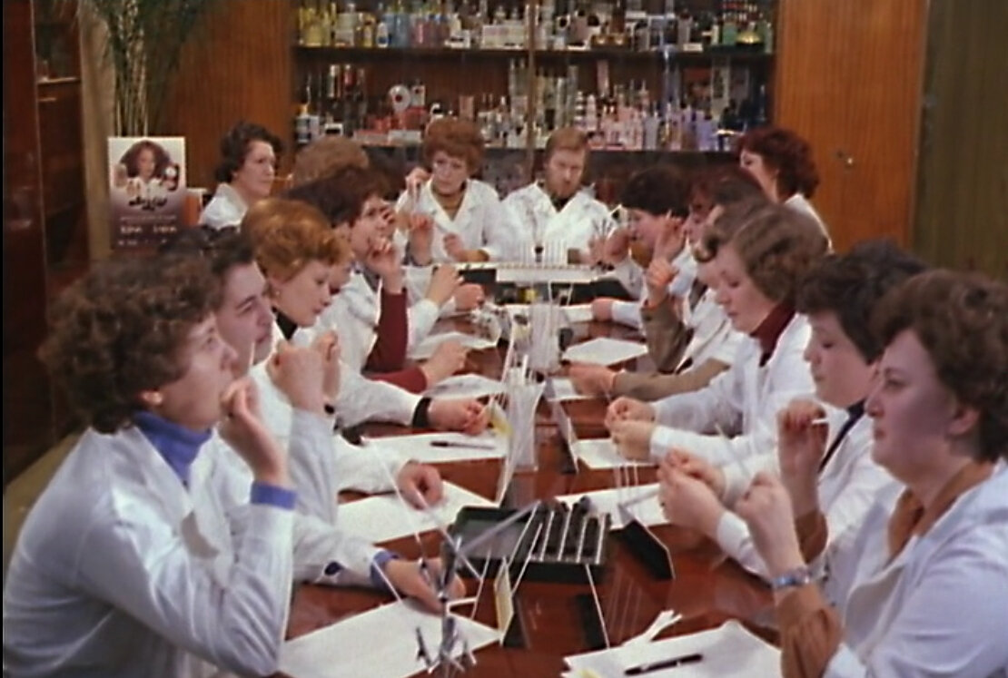 Но мало кто знает, что остальные участники этой сцены - не актрисы, а реальные парфюмеры из Всесоюзного Научно-Исследовательского Института синтетических и натуральных душистых веществ. И эти кадры сняты в помещении ВНИИСНДВ, где действительно решалась судьба большинства советских ароматов - быть или не быть им запущенными в производство.