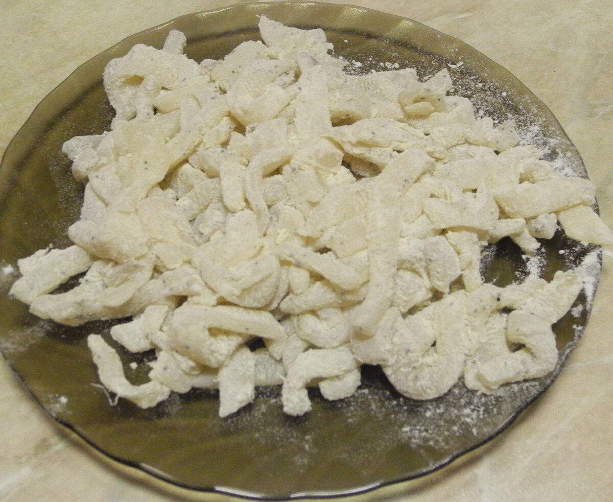 Очищенные, обсушенные тушки кальмаров, за исключением плавников нарезаю полосками и посыпаю мукой. Оставшиеся плавники использую для приготовления фарша.