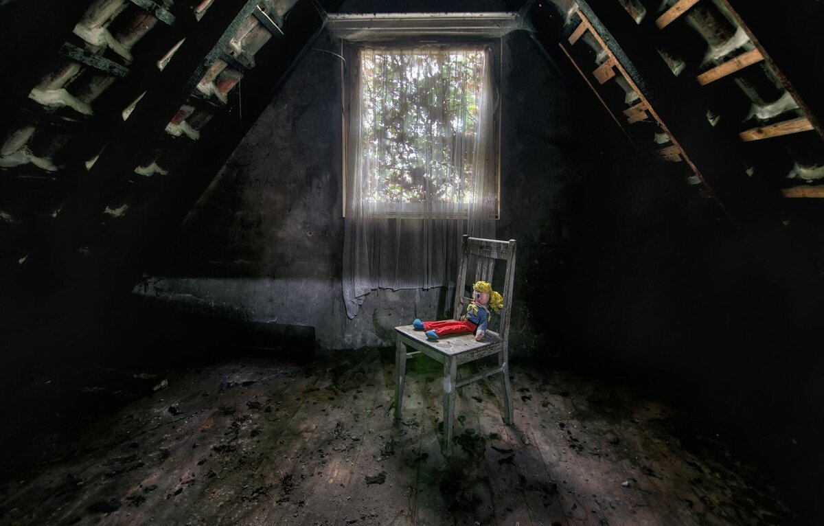 В старом доме на чердаке лежит рассохшаяся гитара и кукла с голубыми глазами, сильно потрепанная мышами.