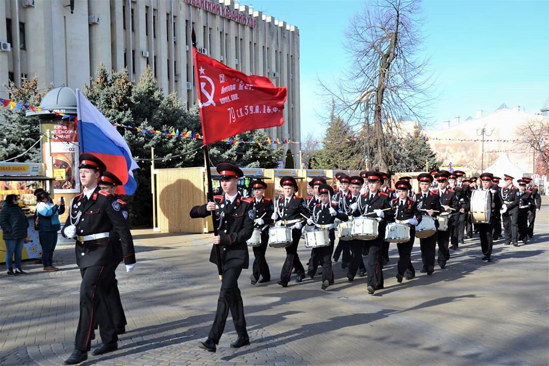 Ейские казаки-кадеты приняли участие в V Краевом смотре-конкурсе строевой казачьей и героической песни «Гром победы, раздавайся!», прошедшем в Центральном концертном зале Кубанского казачьего войска.