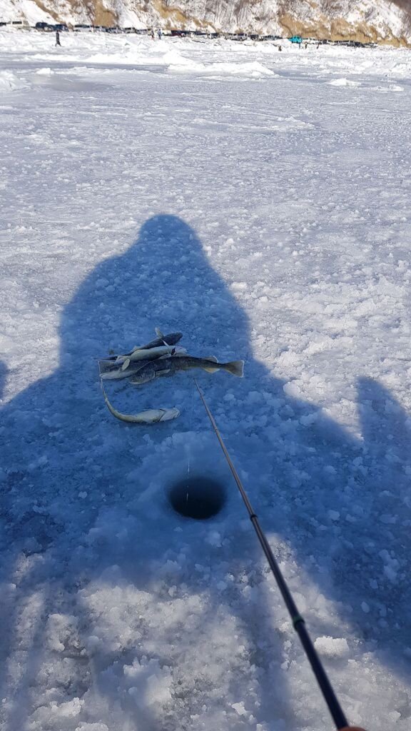 Статья на портале РНарод Сегодня съездил половить навагу, открыл зимний сезон. Вообще я не очень люблю зимнюю рыбалку, но ловля наваги на Сахалине - это народная рыбалка. Ловят навагу абсолютно все. Народу на льду тьма, но рыбы хватает на всех и даже с лихвой. Когда лёд стоит у самих населенных пунктов и подходят косяки наваги, то можно видеть людей в обычной городской одежде с удочками, направляющихся к морю или к устью реки на прогулку, поймать десяток другой наваги. Поскольку бур наш оказался с тупыми ножами, которым оперативно уже не помочь, пришлось пользоваться лунками, которые свободные, оставленные другими рыбаками. За час рыбалки поймали всего 5 шт., а это даже хуже чем плохой результат. За день до нас за пол часа ловили по 20 литровому ведру, да и было видно уходящих рыбаков, которые приехали раньше нас и уже тащили по пол, а то и по мешку рыбы. После часа вялого клёва, решили сместиться дальше, но чем дальше в море, тем глубже и тем не удобнее вытаскивать рыбу. Лучше все