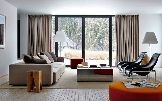 Популярны бескаркасные кресла-мешки, которые мгновенно принимают форму человеческого тела, шезлонги, кресло-яйцо, напольное или подвесное, плетённое. Не будут лишними в зоне для отдыха также кушетки и пуфы. Журнальные или кофейные столики - обязательная составная часть зоны отдыха. В моде столики невысокие, необычной формы. Материалы самые разные: дерево, сталь, стекло и даже ивовые прутья.