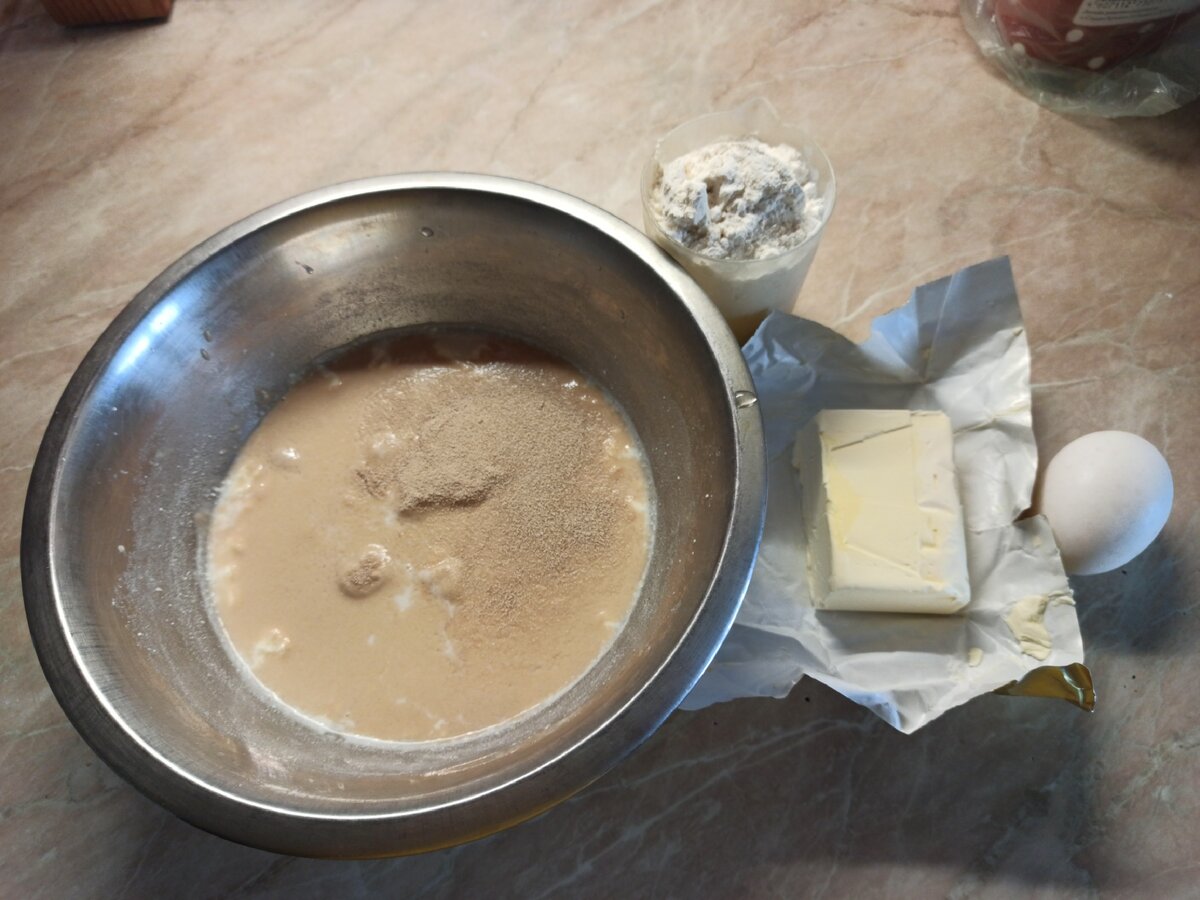Для начала подогрейте молоко и разведите в нем сахарный песок, соль и дрожжи. Дайте не много постоять.