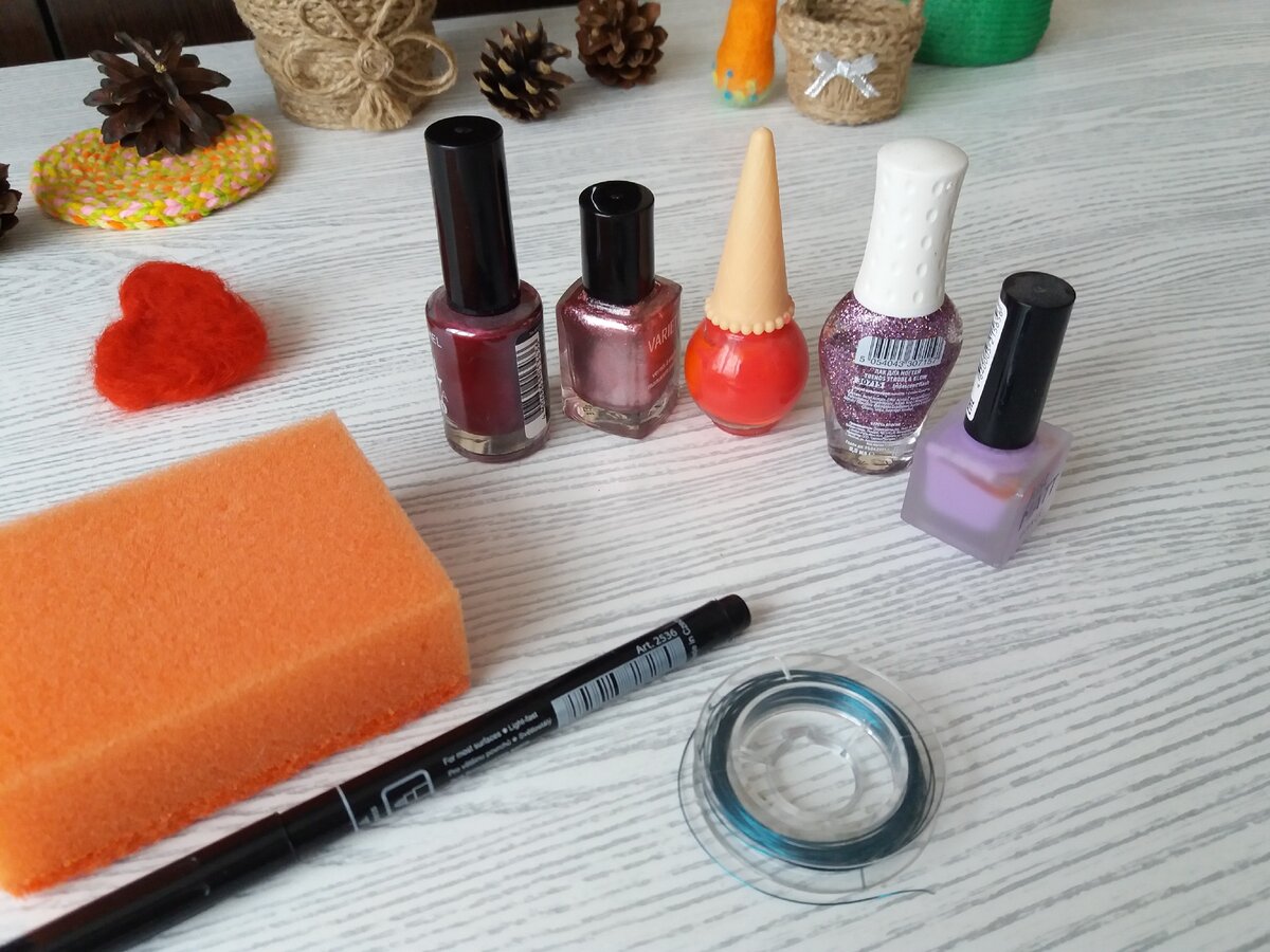 Для работы нужна проволока, лаки для ногтей разных цветов, небольшая губка и маркер или тонкая кисть для работы.
