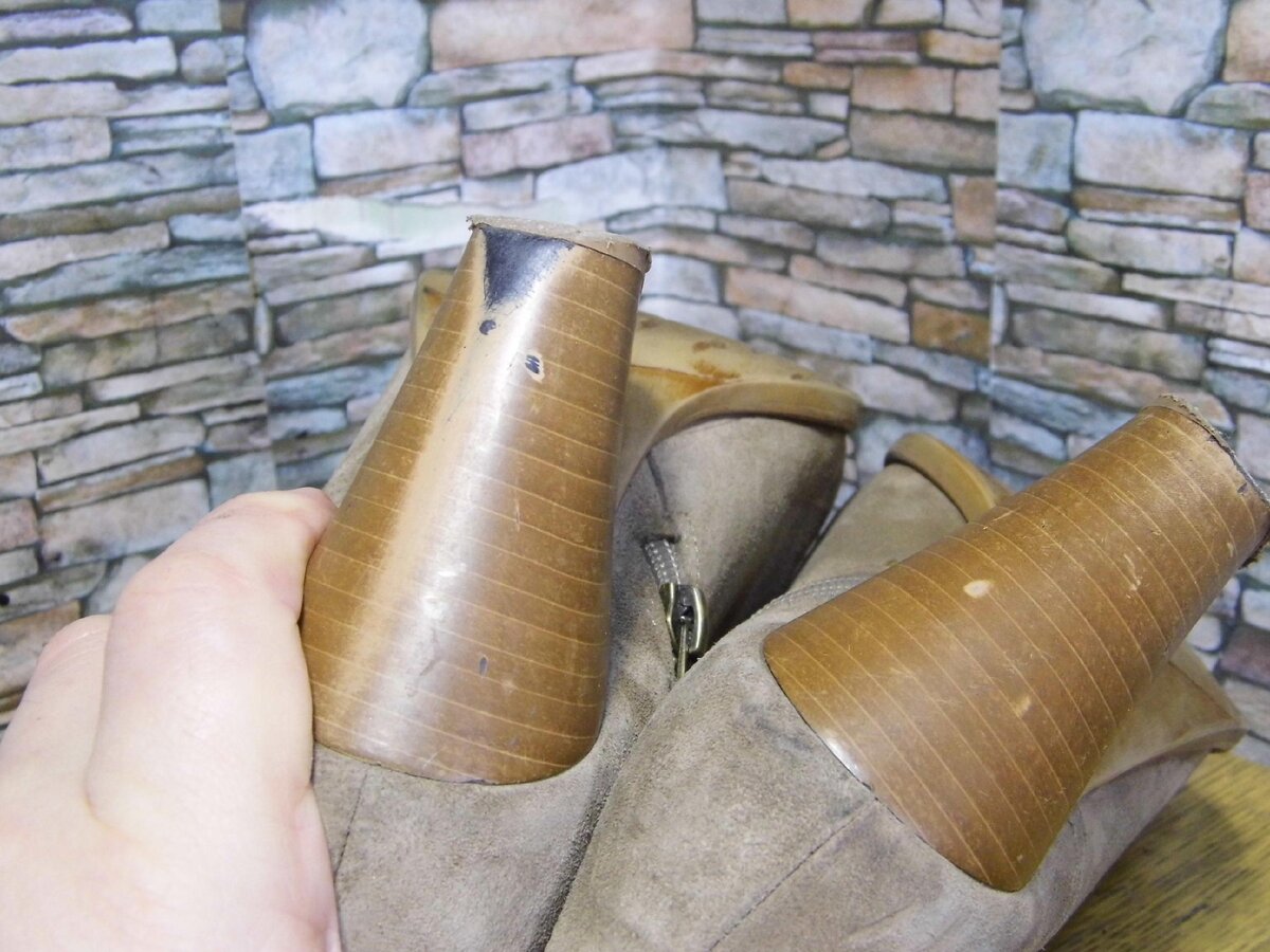 Автоледи почти безошибочно можно определить по характерному износу каблуков. Какая бы ни была краска - она в этом месте сотрётся. Потому что ни одна краска механической прочности не имеет. Далее - как повезёт. Если бы каблук был светлый - может быть, было бы чуть лучше. Маркерами она эти пятна подкрашивать вполне научилась. Здесь этого не случилось. Каблук чёрный. В наиболее тяжёлом случае каблуки могут быть вообще разного цвета. Тогда при износе бросается в глаза не сам износ, а именно разница. Но это, к счастью, бывает редко. Стоит отметить, что её это не особо беспокоило. Главное - нужно было поменять набойки, ибо уже пора. Обратите внимание на то, что уже немного стёрли каблук. С чёрным пятном было пожелание сделать "что-нибудь", хотя бы в светлый. От полной перекраски отказалась, справедливо решив, что это совсем ненадолго. Дамы часто говорят: вот, ставили набойки, спилили каблук, стало неудобно носить! Ну, бывает по-разному. Тем более обрезать каблуки мы уже умеем. В общем случае