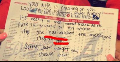 Если вы отправляете сообщения своему любовнику, то возможно, не следует делать это публично. Это урок, который можно извлечь из истории, которая произошла во время бейсбольного матче, когда две девушки заметили, что женщина спереди писала сообщение в своем телефоне, нервничая при этом, и пытая это скрыть от своего мужа. Пока ее партнер сидел справа от нее во время игры в Лоуэлле, штат Северная Каролина, США, эта женщина, отправляла сообщения с эротическими фантазиями, кому-то с пометкой «Нэнси» на своем iPhone. Но позади нее две девушки - по имени Бринн и Делана - по тексту сообщений поняли, что на самом деле это был мужчина по имени Марк, с которым она общалась - и он не был ее мужем. Пара написала записку супругу изменщицы : «Твоя жена изменяет тебе. Посмотри на сообщения под Нэнси!». «На самом деле это не Ненси, а человек по имени Марк Аллен. На моем телефоне есть фотографии, если она удалит сообщения. "Извините, просто подумала, что вы должны знать!" Девушки передала записку мужч