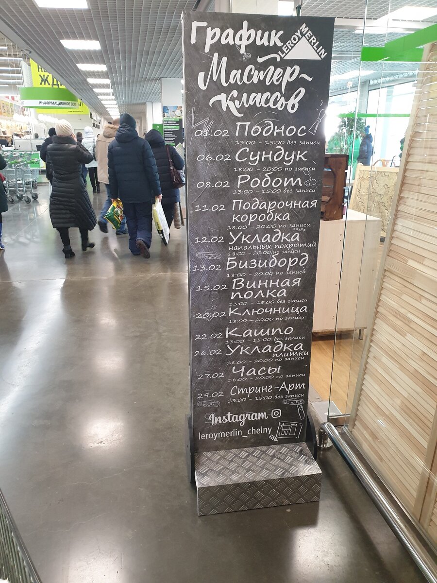 Порой проходят дни, месяцы, а иногда и годы, чтобы взглянуть на привычные вещи по-другому, ПО-НОВОМУ. Так сравнительно недавно, поход в магазин ЛЕРУА МЕРЛЕН, открылся по-другому, ПО-НОВОМУ. Оказывается, в этом магазине для ремонта и строительства, можно делать не только покупки, но посещать мастер классы. Причем – бесплатно. ГДЕ ПРОХОДЯТ МАСТЕР КЛАССЫ? В специально оборудованной комнате при входе в магазин. За счет того, что помещение с стеклянными стенами, можно наблюдать за тем, как проходят мастер классы. Можно даже зайти и присоединится к творческому процессу. Работы, а порой шедевры, также выставлены в мастерской. Это хороший вектор, чтобы понимать, к чему стремится. Порой в голове не укладывается, что такие работы можно сделать всего за пару часов. Как говорится, глаза боятся, а руки делают! Внутри помещение мастерской выглядит так: КАК ПРОХОДЯТ МАСТЕР КЛАССЫ? Под руководством координатора, который раздает материал и объясняет, что нужно делать. Также выдается рабочий фарт