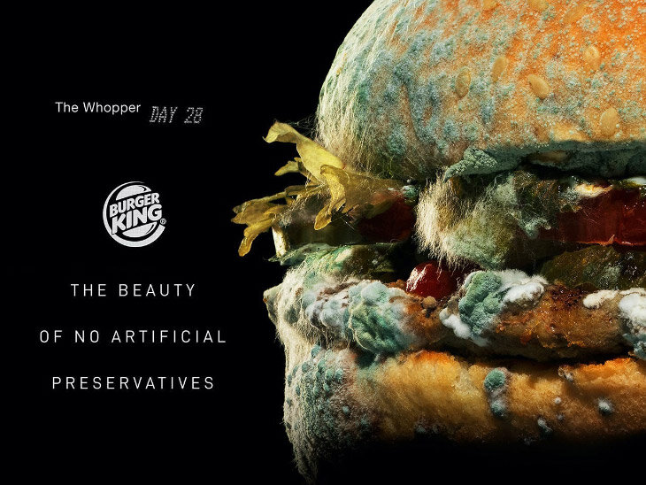 Burger King выпустил смелый и оригинальный рекламный ролик, показывающий, как будет выглядеть его новый бургер через 34 дня. Согласно анализу, 60% взрослых в США в возрасте от 22 до 37 лет говорят, что очень озабочены пищевыми добавками, гормонами роста и вообще синтетической, нездоровой пищей. Думаете, только в России такая есть? Да нет. И вот Burger King выпустил рекламную кампанию, показывающую, насколько их бургеры натуральны и как они плесневают и портятся со временем, как любой натуральный продукт. Причины и следствия понятны, но выглядит реально интересно. А вот и видео