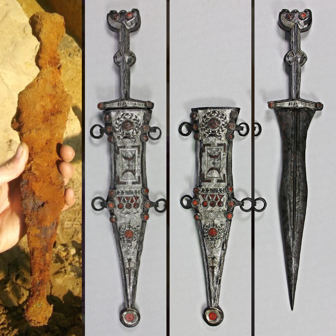 Почва, в которой был обнаружен кинжал, была удалена и отправлена в лабораторию консервации LWL для раскопок и анализа. Спрятанные от коррозии детали кинжала были полностью скрыты до тех пор, пока рентген и КТ не показали, что оружие все еще было в ножнах в его декоративно украшенных ножнах, а металлический пояс, которым он висел 2000 лет назад, оставался неповрежденным.