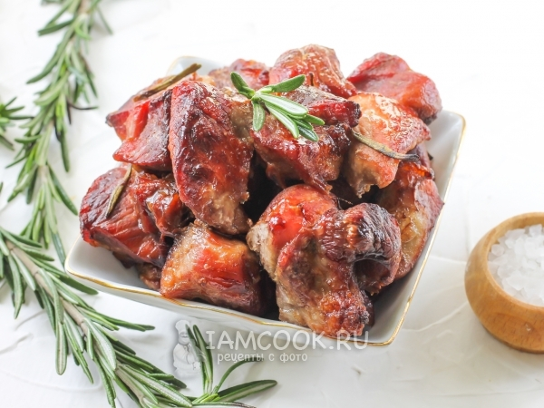 На утро достаем из холодильника мясо в соусе и луке, опять перемешиваем и оставляем еще на 1 час. Промаринованное мясо вытаскиваем из кастрюли, кладем на духовой лист вперемешку с луком. С луком получится еще вкуснее и ароматней. Время готовности зависит от зарумянившейся корочки на поверхности мяса и чаще всего хватает одного часа.