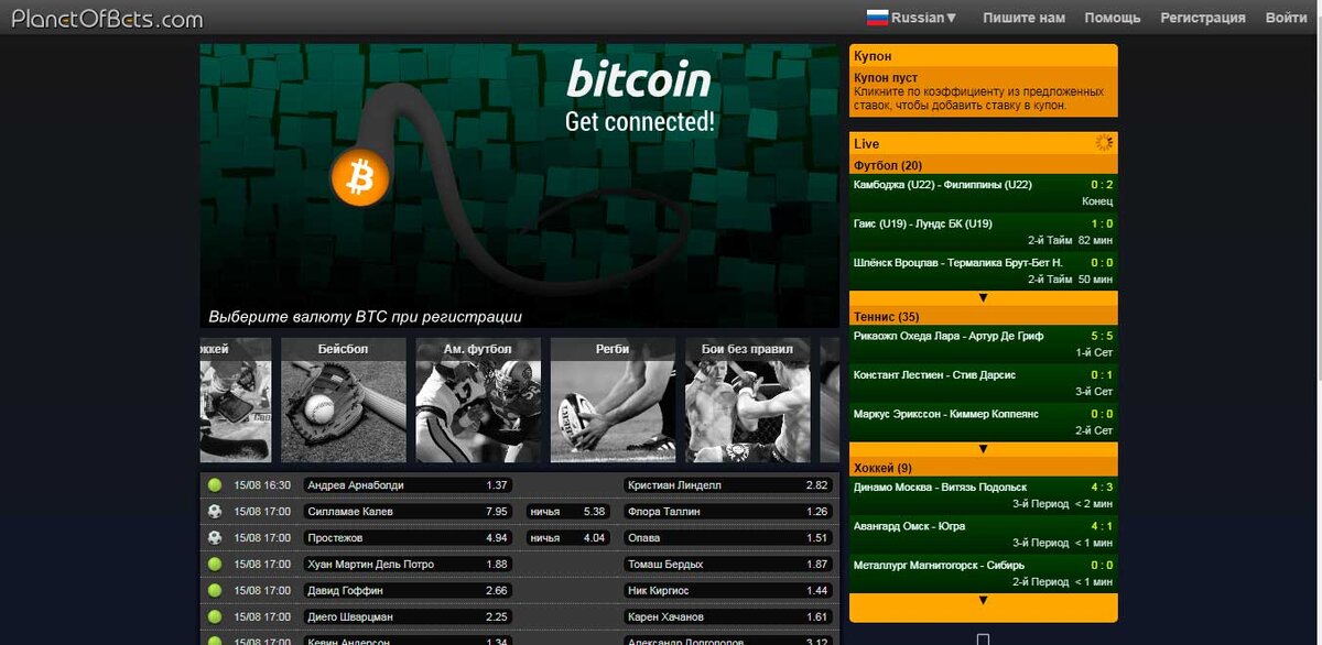 Букмекерская контора Planetofbets (БК Планетофбетс) Букмекерская контора Planetofbets начала работать в 2006-м году и до некоторых пор работала без лицензии. Только в 2015-м году БК обзавелась сублицензией Кюрасао. Большинство клиентов «Планетофбетс» – это игроки с постсоветского пространства (до 80%). Основной сайт представлен на 4-х языках: английском, испанском, русском и украинском. Регистрация по ссылке http://www.planetofbets.com/?ref_id=551443 Регистрация в БК Planetofbets Регистрация в «Планетофбетс» проста. Новому игроку достаточно будет указать имя и фамилию, адрес электронной почты, номер телефона, выбрать логин и пароль, а также валюту счета. Официальный сайт Ресурс выполнен в ярких цветах, которые редко встречаются у букмекеров. Навигация по ресурсу интуитивно понятна, здесь нет нагромождения баннеров и вкладок, которые только запутывают беттора. В самом верху страницы можно переключаться между разделами: Ставки на спорт, Казино, Слоты, Виртуальный спорт. Сайт