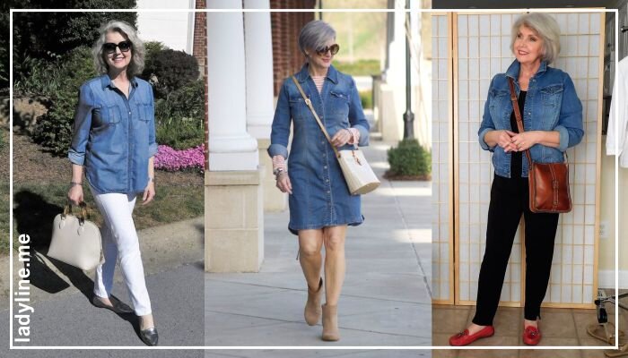 Деним в 2020 году превзошел сам себя, в тренде достаточно много вещей из данного материала. Джинсовые вещи чудесно смотрятся не только на молодых девушках, современные модельеры доказывают конкретными примерами, что деним идеально подходит также модницам 50+. Ниже представлена великолепная подборка аутфитов для зрелых дам, изюминкой которых являются вещи из денима. Вещи из денима достаточно просто сочетать с базовым гардеробом любой современной модницы. Джинсовая рубашка — тренд новой моды, который уже покорил сердца многих ценителей прекрасного. Данная вещь обязана быть в гардеробе у всех дам любого возраста и телосложения. Рубашка, выполненная из плотного денима удачно сочетается с классической юбкой-карандаш, белыми брюками, базовыми джинсами и кюлотами. Отличным и современным сочетанием будет: джинсовая рубашка + белые брюки + остроносые мюли + объемная трендовая сумка — благодаря данным вещам получается простой и лаконичный образ, который подойдет любой даме 50+. Стильную и трендо