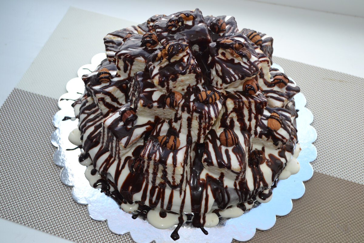 Всем привет! Существует множество рецептов этого вкуснейшего торта, но я готовлю его по рецепту своей мамы уже давно и изменять ему не собираюсь. Торт получатся очень мягким, в меру сладким и нежнейшим на вкус. Делюсь рецептом. Нам необходимо будет испечь два коржа - белый и коричневый. Как коричневый, так и белый начинаем заводить одинаково. Одну банку сгущенного молока смешиваем со 100 граммами растопленного сливочного масла, хорошо перемешиваем. Сгущенное молоко использую только из цельного молока, без каких либо заменителей молочного жира. Теперь необходимо в каждую порцию добавить два куриных яйца комнатной температуры, хорошо перемешать. А вот теперь в одну из таких порций добавляем 3 столовые ложки какао порошка смешанные с 130 граммами пшеничной муки и 10 граммами разрыхлителя, просеиваем через сито в три приема постепенно добавляя в получившуюся массу. Это у нас будет коричневый корж. Для приготовления белого коржа нужно будет в массу добавить 150 грамм пшеничной муки сме