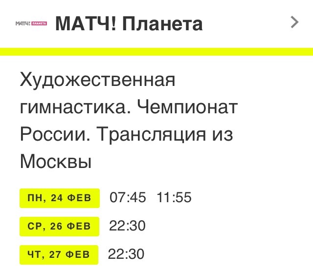 23 февраля 20:00 — Телеканал Матч!Страна покажет запись финала в индивидуальном многоборье 24 февраля 9:00 — Телеканал Матч!Страна в покажет запись финала в индивидуальном многоборье 11:50 — трансляция финальных соревнований на Sportbox и Матч!Страна
