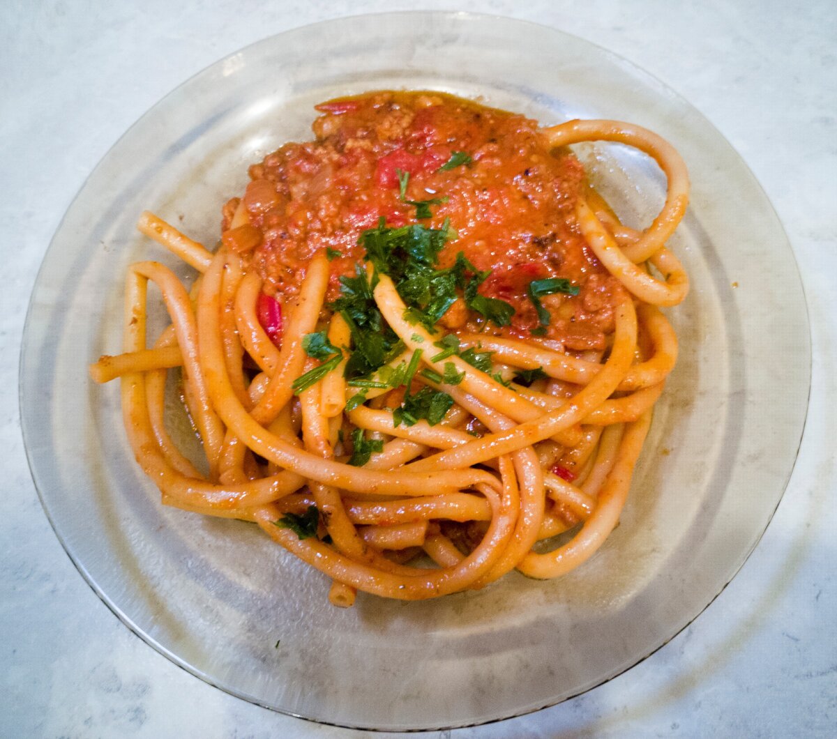 Спагетти в томатно-фаршевой заправке с сыром.