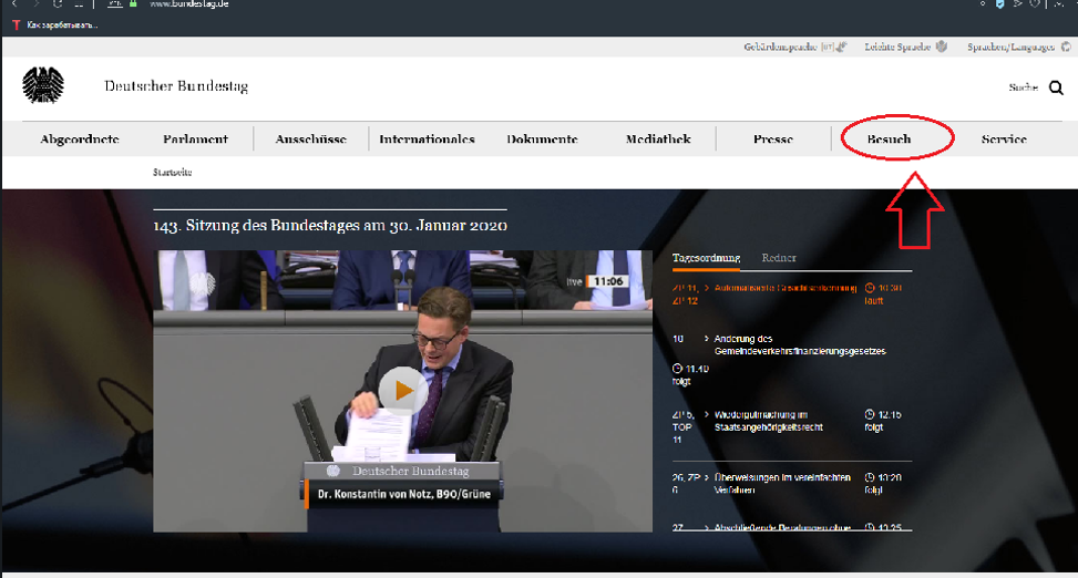 - На сайте выбирать язык не придется, потому что зарегистрироваться онлайн можно только на немецком. Если вы читаете эту статью, то этот язык знать совсем не обязательно. Зайдя на сайт нужно кликнуть на «besuch».