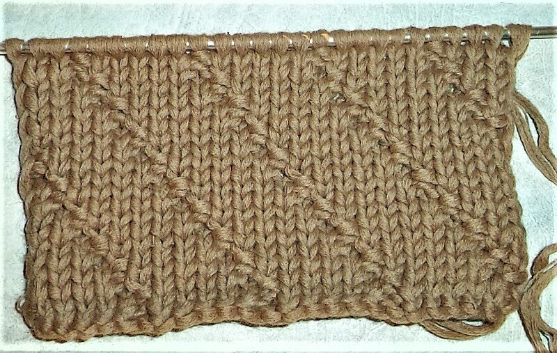 Диагональный узор из лицевых и изнаночных петель с наклоном вправо. Количество петель для узора кратно 6 плюс 2 кромочные.