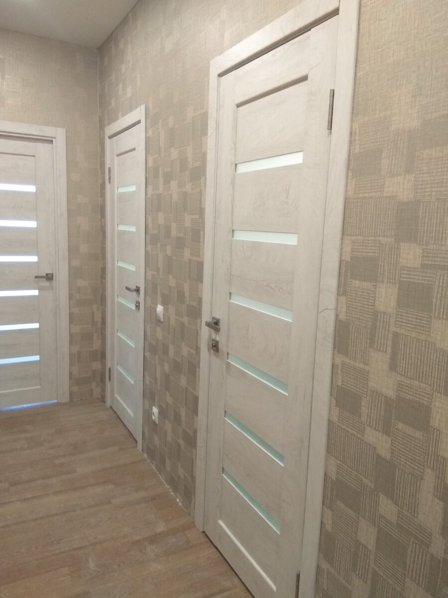 Когда пришло время выбирать двери, мнение у нас было одногласное-двери должны быть белые или хотя бы светлые. Остановились на расцветке- снежный дуб. После того как определились с дизайном дверей заказали их установку. Получилось что обычных распашных дверей будет 4 и одна дверь состоящая из двух- это раздвижная, закрывающая широкий арочный проем между залом и кухней. Установкой занимался один