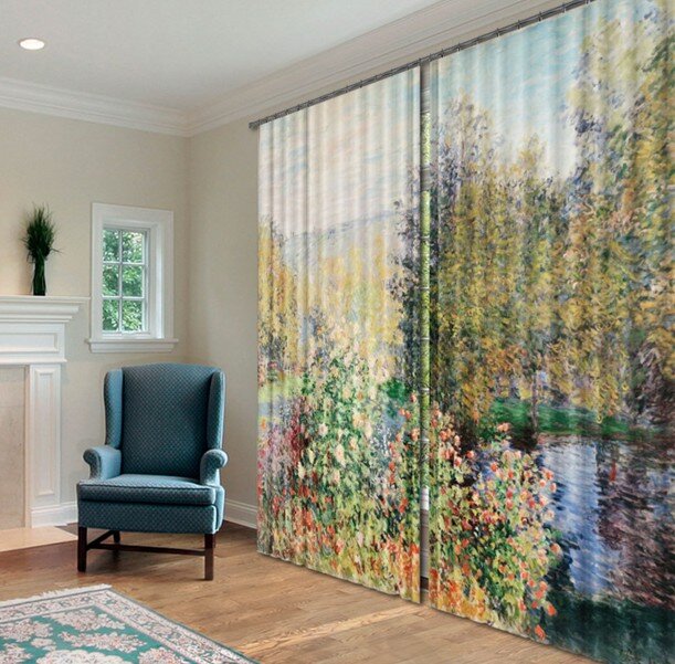 Фотошторы, окрашенные в доминирующие природные цвета (зелёный, голубой, песочный), будут хорошо сочетаться почти с любой обстановкой.