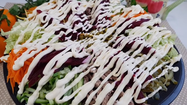 Как хотите, так и называйте! На вкус салата это не влияет! Простой, из доступных ингредиентов! Французский салат «Радуга» можно приготовить перед подачей на стол, ему не надо настаиваться! Майонез взять лучше домашний и корейскую морковь тоже приготовить самим. У листьев пекинской капусты срезать толстые прожилки: они нам не нужны! А вот мясо, мясо вы можете взять любое: главное, не переварите его – пусть остается сочным! Красивый, сытный, сочный и ароматный салат – настоящий шедевр из доступных продуктов. Он способен не только порадовать вкусом, но и подарить праздничное настроение. Необходимые ингредиенты: Как приготовить французский салат «Радуга» В меру пикантный, сочный французский салат «Радуга» замечательно смотрится на любом столе! Сытный и по-праздничному красивый – он подарит море вкуса и отличное настроение! Создаем настроение: готовим все красивое! И вкусное!!!! Другие рецепты блюд, способных украсить ваш стол, смотрите на нашем сайте «Девчата».