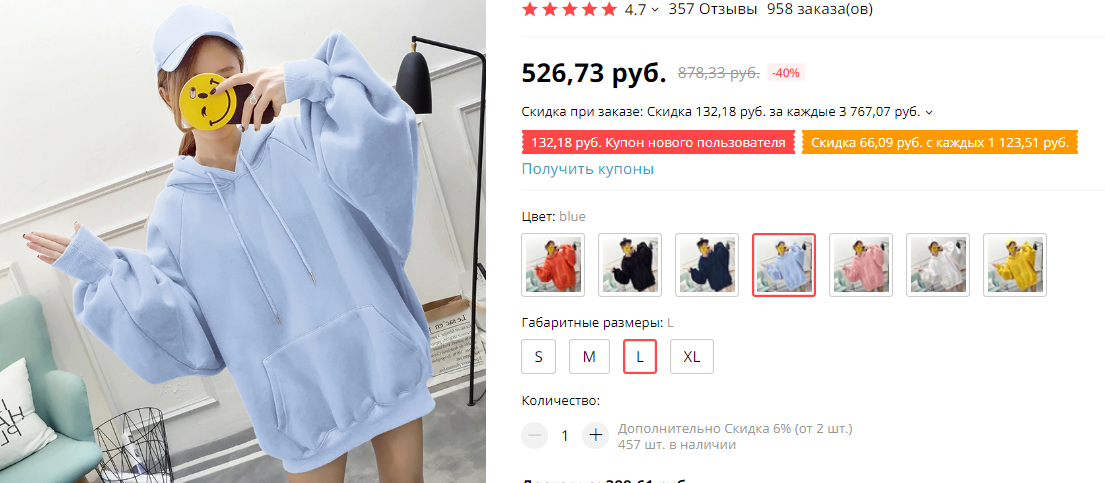 526 рублей, отличное однотонное худи, много положительных отзывов. Идеальный вариант по соотношению цена-качество. Для получения эффекта оверсайз, как на фото продавца, берите на размер больше. Что приходит на самом деле. Смотрим отзывы. Но если для вас такой вариант выглядит слишком просто, смотрим дальше :)