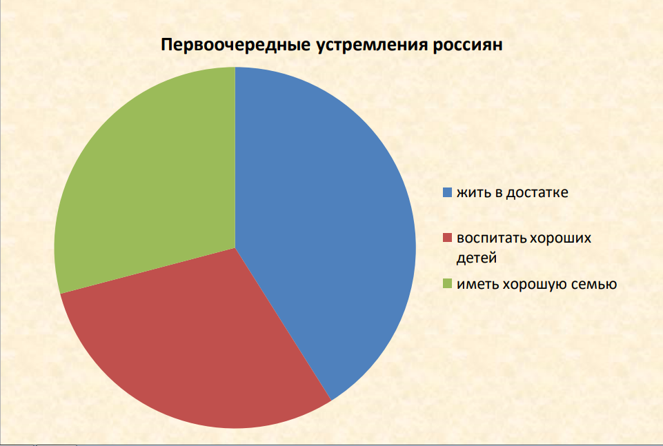 Первоочередные устремления россиян – жить в достатке (эту цель отметили 55% опрошенных), воспитать хороших детей (40%), иметь хорошую семью (39%).