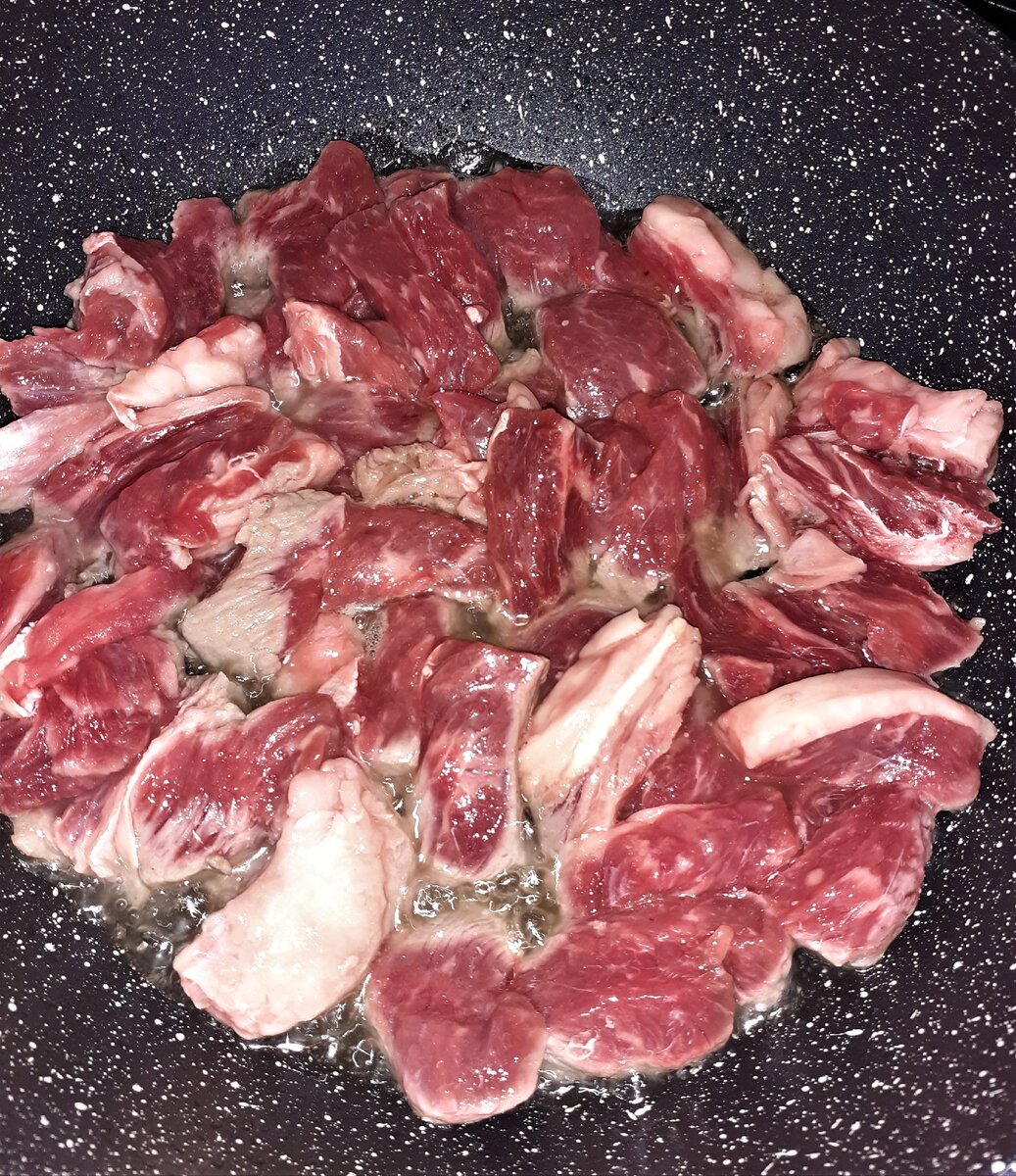 Беру кусок говядины граммов 700, режу на брусочки, кидаю в глубокий сотейник с толстым дном и обжариваю до золотистой корочки. Теперь можно посолить. Пока мясо с овощами тушится, чищу картофель и режу крупными кусками. Добавляю к мясу, накрываю крышкой, сбавляю огонь и томлю все это дело час. Добавляю зелень. Еще 5 минут под крышкой. Перемешиваю и выключаю. Блюдо готово. Накрываю на стол. Пора обедать. Приятного аппетита! А муж еще порезал сыровяленой говядины - сам готовил! Но это уже другая история. Вам тоже вкусняшек! Ставьте лайки, подписывайтесь н