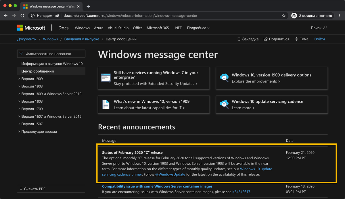 Как сообщила Microsoft, в ближайшее время будет доступен «С» релиз «необязательных обновлений» для всех поддерживаемых версий Windows 10 и Windows Server О том, что Windows 10 и Windows Server получат очередные обновления в феврале, Microsoft подделилась на официальной странице Центр сообщений Windows. Февральский Вторник патчей получился крайне неудачным для компании. Сразу после выхода обновлений, сначала появились соообщения о том, что обновление KB4532693 для Windows 10 скрывает пользовательские данные и загружает неправильный профиль. Затем Microsoft подтвердила проблемы с обновлением KB4524244 для Windows 10 и «откатила» его. Теперь пользователям стоит ожидать новую порцию исправлений для всех поддерживаемых версий Windows 10 и Windows Server. Хотя, в этот раз патчи будут иметь статус «необязательные обновления». Учитывая, что до конца февраля осталась одна неделя, можно предположить, что эти обновления станут доступны в начале следующий недели. Первыми их также могут получить д