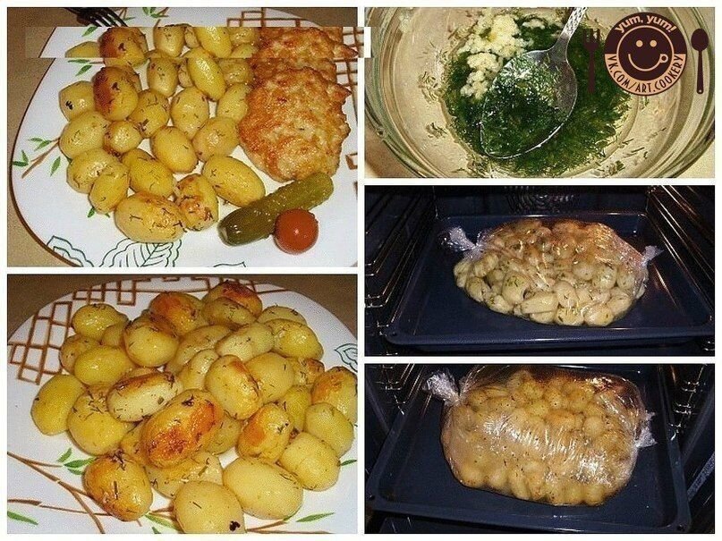 Давайте приготовим картофель, запеченный в духовке и не просто в духовке, а в пакете с соусом. Пожалуйста, обратите внимание, что эта картошечка делается в специальном пакете. Такие пакеты для духовки продаются в супермаркетах, они не плавятся при высокой температуре. Ингредиенты: - 1 кг картофеля (средний) - 2-3 зубка чеснока - 3 ст. ложки растительного масла - зелень (укроп, петрушка) - приправа для картошки - соль Приготовление: 1. Картошку чистим, промываем, обсушиваем и помещаем в большую миску. Если картошечка крупная, разрежьте ее на части. Обязательно накалываем ее зубочисткой в нескольких местах. 2. Чеснок чистим и пропускаем через чесночницу. 3. Зелень промываем, просушиваем и мелко режем. 4. Для приготовления соуса в отдельной посуде смешиваем растительное масло, чеснок, зелень, приправу для картофеля, соль по вкусу и хорошо перемешиваем. Полученным соусом поливаем картофель и все хорошо перемешиваем. 5. В пакет для запекания перекладываем картофель, защипываем его или з