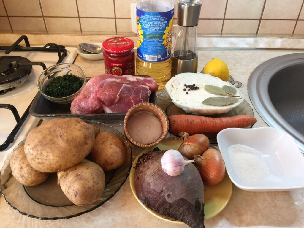 Ингредиенты: Способ приготовления: Мясо помыть, поставить вариться. Первую воду сливаем через 10 мин после закипания. Потом варим в подсоленной воде до готовности, примерно 1,5 часа. На растительном масле слегка обжариваем лук, затем добавляем морковь и продолжаем обжаривать на слабом огне 5 мин. Добавляем потертую на терке или порезанную тонкими кусочками свеклу, все перемешиваем. К овощам добавляем бульон, томатную пасту, лимонный сок и тушим мин 40. Когда бульон будет готов, достаём мясо ( у меня были свиные рёбрышки), отделяем мякоть от косточек, режем на кусочки и отправляем обратно в кастрюлю. Режем капусту и кладём в бульон. Затем кладём в кастрюлю порезанную на кубики картошку. Варим мин 20, пока картошка не станет мягкой. В конце закладываем тушеные овощи и кипятим 2 мин. В самом конце добавляем зелень, перец, лавровый лист и мелко порезанный чеснок. Сразу выключаем газ и даём настояться мин 15. Подавать со сметаной. Отличным дополнением будут пампушки с чесноком. Приятного ап