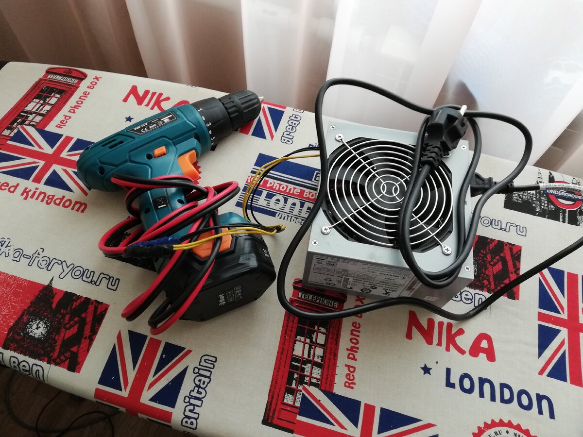 Давно уже лежал дома шуруповерт Bort, аккумулятор выдохся, новый аккумулятор стоит столько же сколько такой шурик, а выбрасывать жалко. Посмотрел ролик на ютубе и решил переделать шурик на работу от сети. Вот ссылка на ролик ютуба Данная статья интерпретация этого ролика на свой лад. Итак что понадобится: 1. Блок питания от компа, его взял со списанного с работы, может у вас тоже есть такая возможность. 2. Шнур 2 метра, можно и больше сечением 3 мм. Я взял на 4, какой был в магазине, это оказался аудио кабель, можно было взять и попроще. 3. Конденсатор, взял на 16v 6800mF 4. Болтик м3 с потайной головкой. Итак все детали собраны, начнём с блока питания. Нужно замкнуть чёрный и зелёный провод, чтобы он работал без компа: Здесь их замыкает перемычка из гвоздя. Потом я отсоединил их от штекер и засунул внутрь короба, а все лишние провода срезал. Для питания взял два крайних жёлтых и два чёрных провода, на их конце был узкий штекер. Предварительно проверил мультиметром, было чуть бол