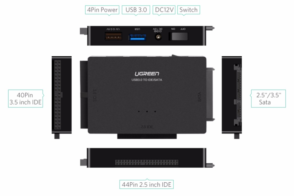 Всем привет. Много лет использую USB 2.0 конвертер от AgeStar FUBPC с IDE\SATA. Вещица отличная, проблем никаких, всем устраивает, кроме низких скоростей USB 2.0. Тестирование поверхности дисков объемом от 3-4Tb и выше может спокойно занять сутки и больше. По этой причине неспешно присматривал что-то похожее, но с более шустрым USB 3.0. Безымянный товар брать не стал, т.к. теоретические проблемы совместимости могут вылезти в будущем, выбор остановил на продукции компании UGreen, которая, забегая вперед, принесла те самые проблемы не хуже ноунейм вариантов.