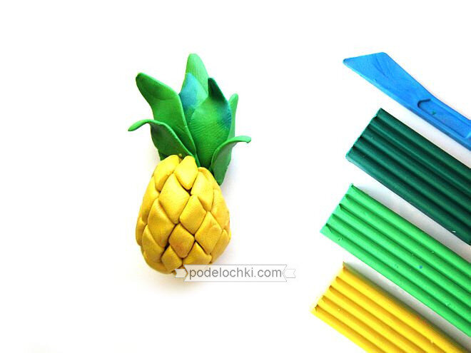 — стек пластиковый. Как слепить ананас из пластилина Этапы лепки ананаса из пластилина: 1. Отрезаем часть пластилина из желтого бруска. Разминаем и получаем шар, который вытягиваем и придаем овальную форму. 2. Также еще отрезаем стеком часть пластилина, окрашенного в желтый цвет. Делим часть на маленькие кусочки из которых формируем пальцами мелкие ромбы. Именно из них вылепим текстуру ананаса. 3. П