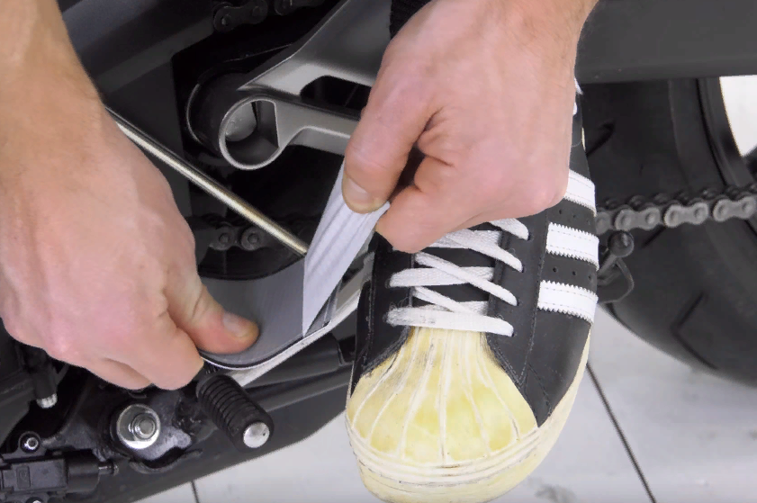 1. Первый лайфхак: если ваша обычная обувь протирается об лапку переключения передач, просто перед выездом заклейте часть носка армированным скотчем, и все, больше ваша обувь не будет стираться, и прослужит намного дольше.