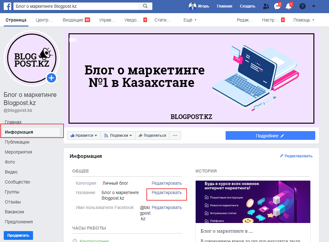 Статья сайта blogpost.kz Как поменять название на бизнес странице Facebook Как поменять название страницы в Facebook? Если вы часто, работаете с Facebook страницей, и захотели поменять название страницы просто так это сделать не получится. Так как после подачи запроса на изменение вам скорее всего придет отказ. Но есть небольшой лайфхак как переименовать бизнес страницу, чтобы ваш запрос был одобрен со 100% вероятностью. Для того, чтобы переименовать название страниц, необходимо к старому названию страницы добавить новое название через тире. Для примера давайте возьмем переименование страницы Blogpost.kz, допустим мы хотим переименовать страницу Блог о маркетинге Blogpost.kz на Маркетинговое Агентство КУБ