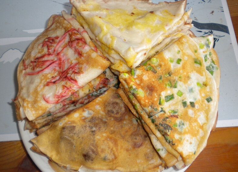 Обычно вы едите блины с различными заправками сверху-сметаной, икрой, вареньем или чем-то еще. Сегодня мы сделали"блины с припеком", что означает буквально блины с начинкой. Технически это похоже на омлет: вы жарите начинку, а затем вливаете т