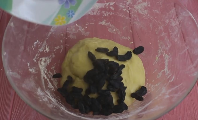 Опару и смесь с яйцом перемешиваю, туда же добавляю остаток муки. Вот и все, делаю тесто, дополнив замес изюмом.