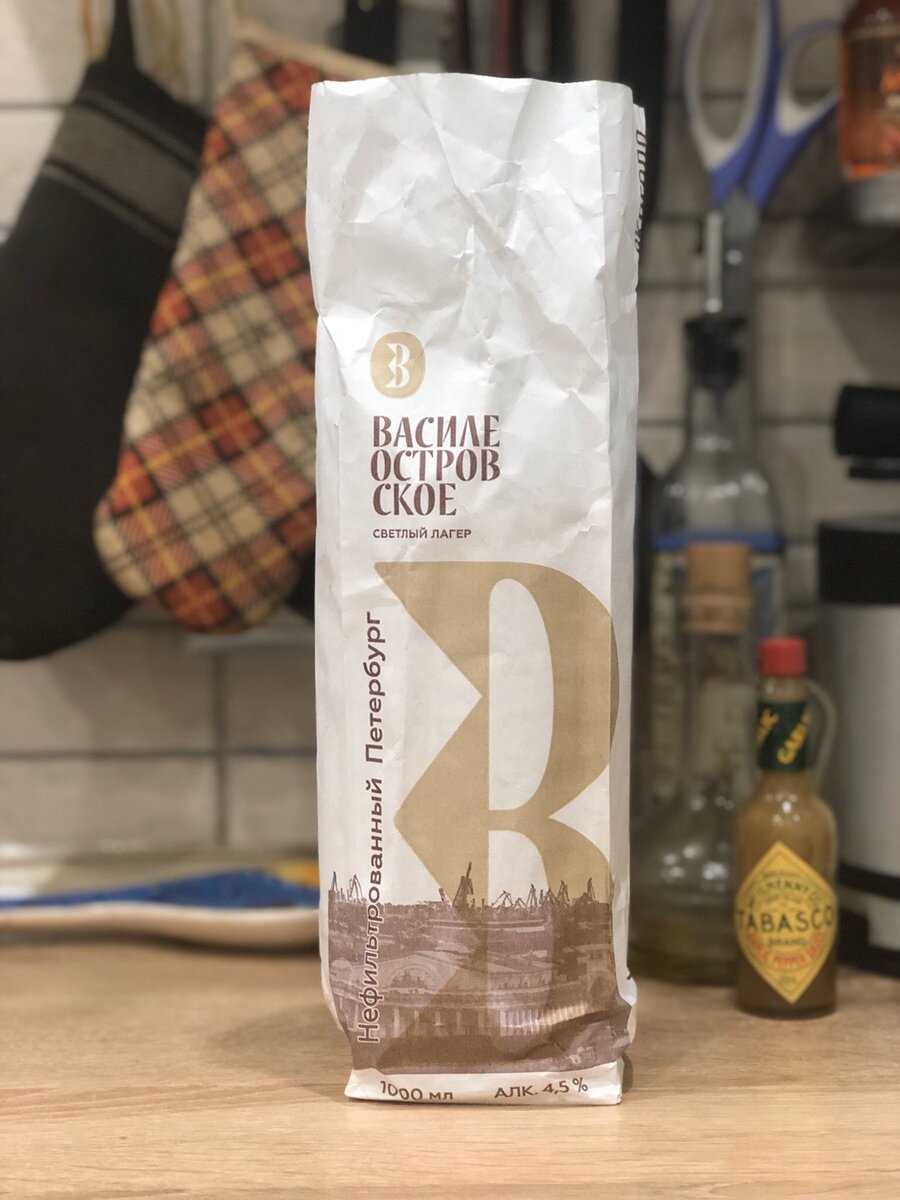 Обязательным предпраздничным атрибутом является поездка в гипермаркет. Именно там, перед 23 февраля, встретил разлитое по литровым бутылкам в симпатичных бумажных пакетах пиво от Василеостровской пивоварни - Светлый Фильтрованный Лагер.