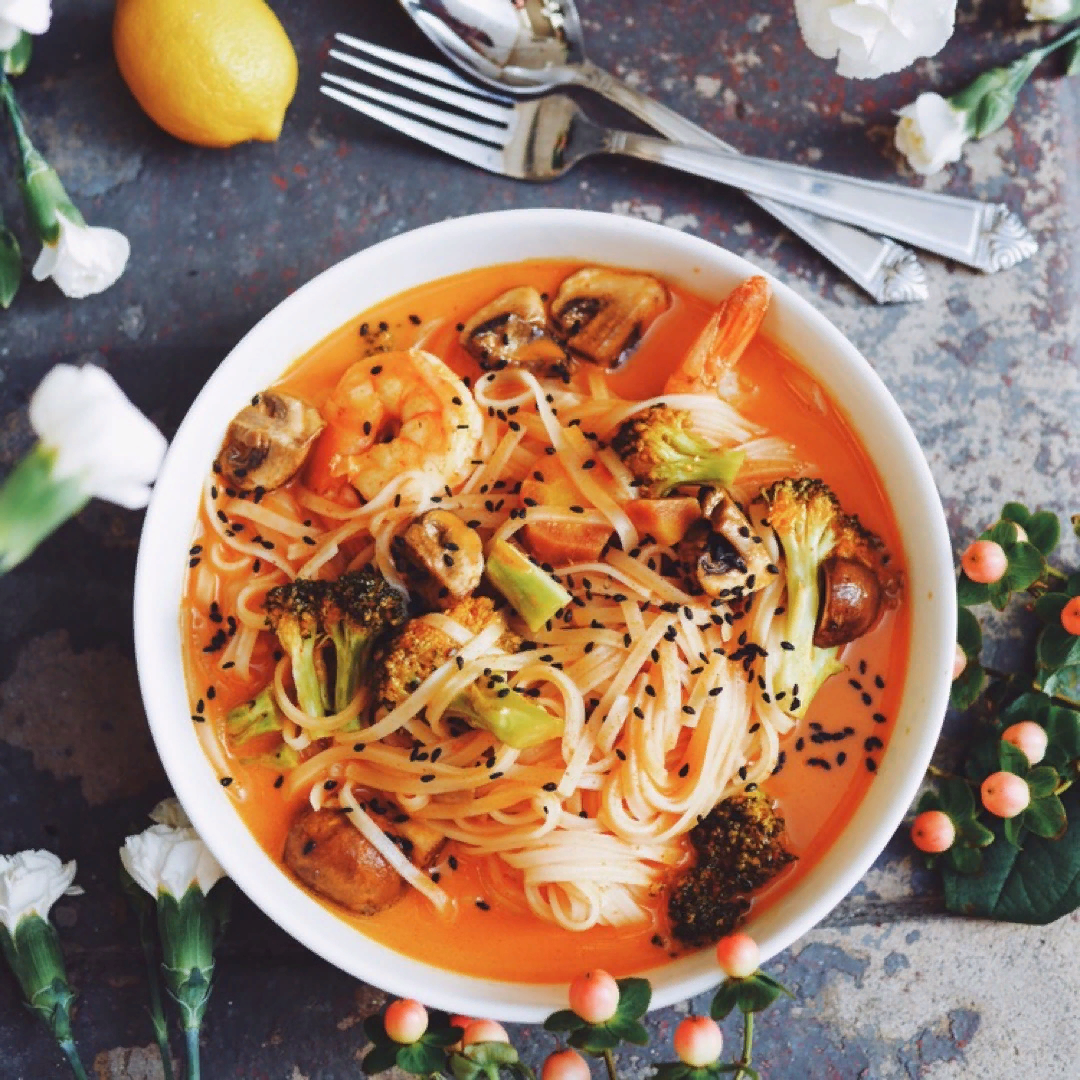 1 пакет красной тайской пасты карри 2 банки кокосового молока 1 пакет рисовой лапши 2 чашки брокколи 1½ стакана грибов 1 стакан воды 1 лимон-сок 2 столовые ложки меда