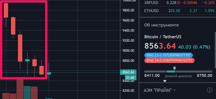 Пока я сижу и любуюсь на свои 9000$ начинается такое: В данном случае каждая красная свеча равна одному дню. На самом же деле все было красным даже на 15-и минутном графике, и за этим я наблюдал.