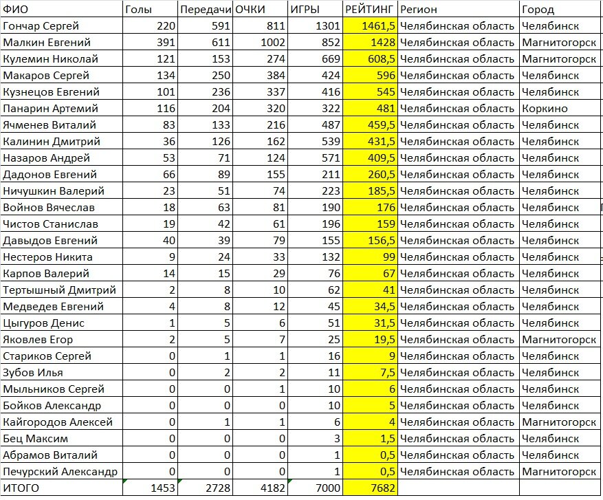 Челябинская область является Меккой хоккея в России. Здесь базируется "Трактор" из Челябинска и "Металлург" из Магнитогорска, которые являются кузницей талантов. Рейтинг формируется следующим уровнем: Рейтинг игрока=(1,0*ОЧКИ + 0,5*МАТЧИ) *у вратарей в категорию очки попадают выигранные матчи РХРР = сумма рейтинга игроков из этого региона Всего в НХЛ играло 28 представителей Челябинской области (22 из Челябинска, 5 из Магнитогорска, 1 из Коркино). Наибольшее число баллов до начала текущего сезона принес Сергей Гончар (1 кубок Стэнли). Но в нынешнем сезоне его обойдет Евгений Малкин (один из пяти россиян, кто перешагнул рубеж в 1000 очков, 3 кубка Стэнли, приз "Колдер Трофи", "Харт Трофи", "Конн Смайт Трофи", дважды лучший бомбардир регулярки, дважды чемпион мира). Ещё один уроженец Магнитогорска Николай Кулемин долгое время играл в "Торонто" и "Айлендерс". Чемпион мира 2012 и 2014. На 4 месте по баллам располагается Сергей Макаров, лучший новичок НХЛ 1990 года. 2 раза выигрывал Оли