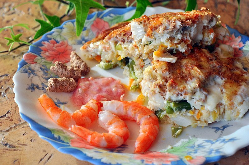 Все ингредиенты брала на глаз Отварила стручковую фасоль и цветную капусту в подсоленной воде. Обжарила на небольшом количестве масла мелко порезанный лук, добавила натертую на терке морковь, добавила немного воды, потушила. Смешала с фасолью и капустой, добавила 1 яйцо, немного тертого сыра, соль, перемешала. Выложила овощную смесь в форму. На овощи разместила порезанное кубиками филе рыбы, смешанное с зеленью и солью. Сделала заливку. 2 желтка смешала с тертым сыром, двумя ложками йогурта, ложкой отрубей, и ложкой домашней аджики, немного посолила. Вмешала осторожно 2 взбитых в крепкую пену белка. Смесью залила рыбу на овощной перинке. Запекала в нагретой до 180 градусов духовке примерно 30-35 минут/